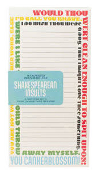 Why waste precious time composing threats, curses, and put-downs when you can treat your foes to a parti-coloured horde of sweet abuse? The Shakespearean Insults Notepad has 65 unique alternating pages, and more than a dozen insults (no mothers implicated) - proving Shakespeare did more than squander his eloquence and ardor on a couple of sticky love poems.